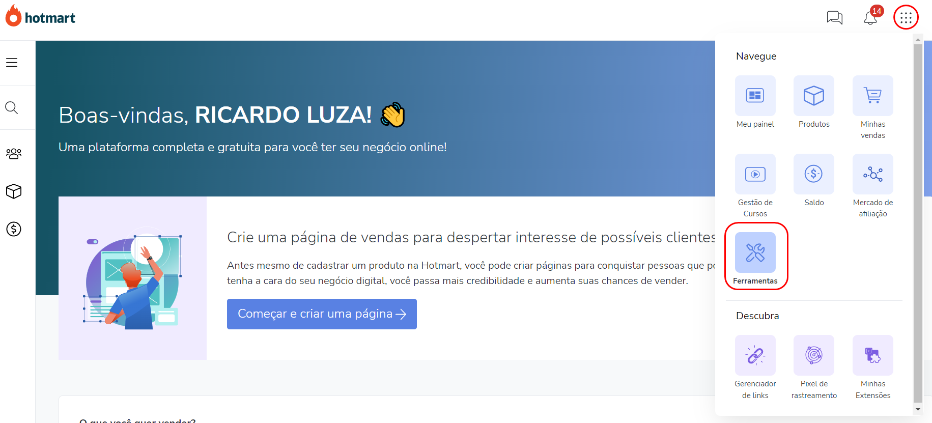 1.Entrar na sua conta Hotmart e clicar no menu Ferramentas.