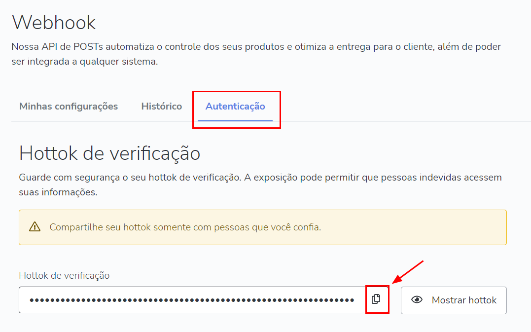 6.Agora clique no menu Autenticação e em seguida clique no botão Copiar hottok.