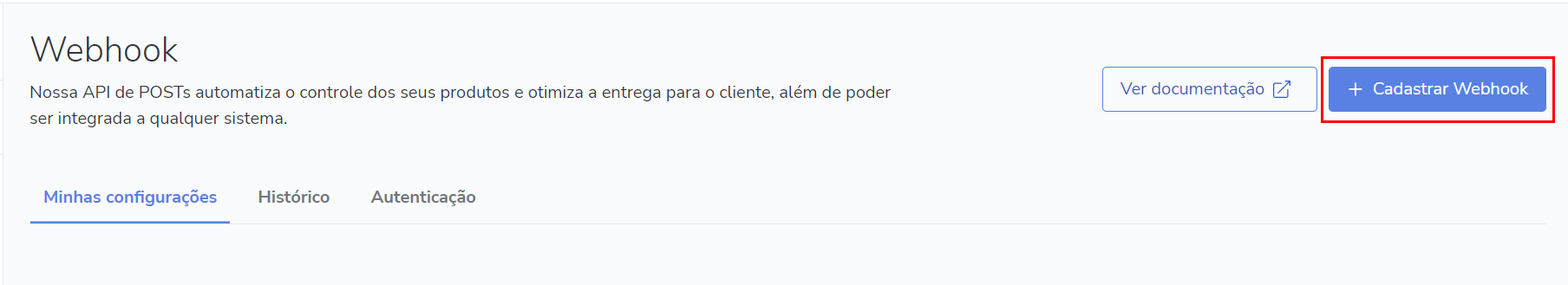 3.Na página de configurações do Webhook da Hotmart clique no botão azul do lado direito no topo ?Cadastrar Webhook?.