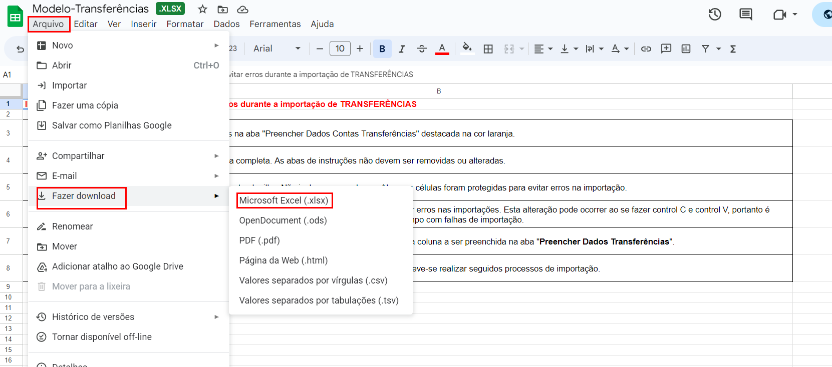 5.Faça o download da planilha clicando em: Arquivo, Fazer download, Microsoft Excel(.xlsx).