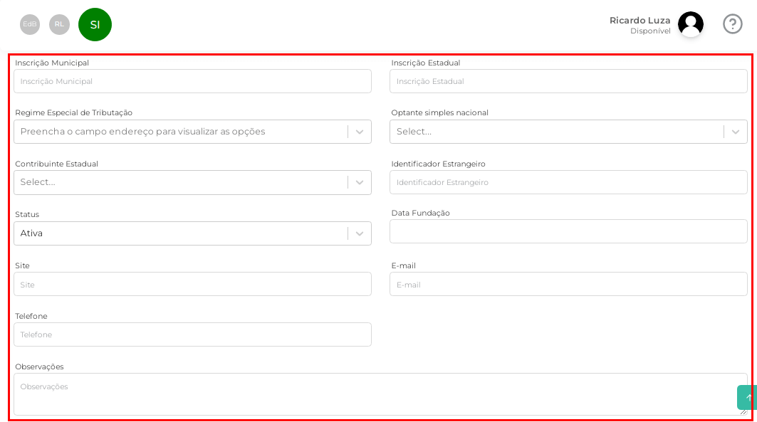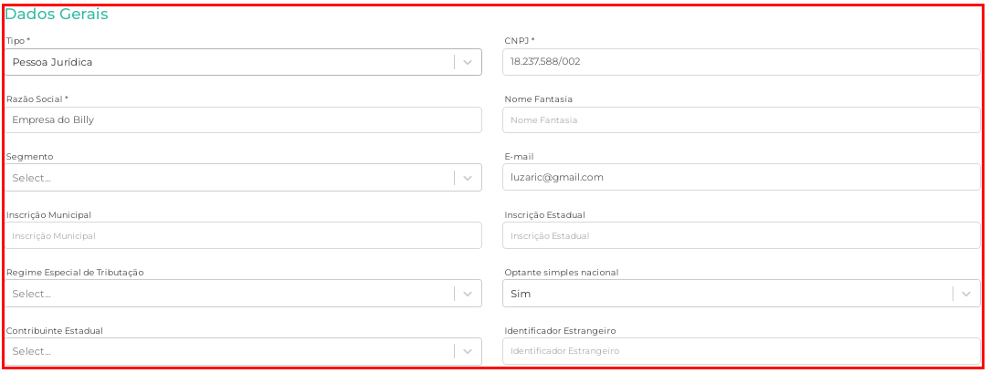 Após salvar as informações solicitadas surgirá novos campos a serem preenchidos no formulário. O correto preenchimento destas informações é de extrema importância e está diretamente ligado a emissão de notas fiscais.
